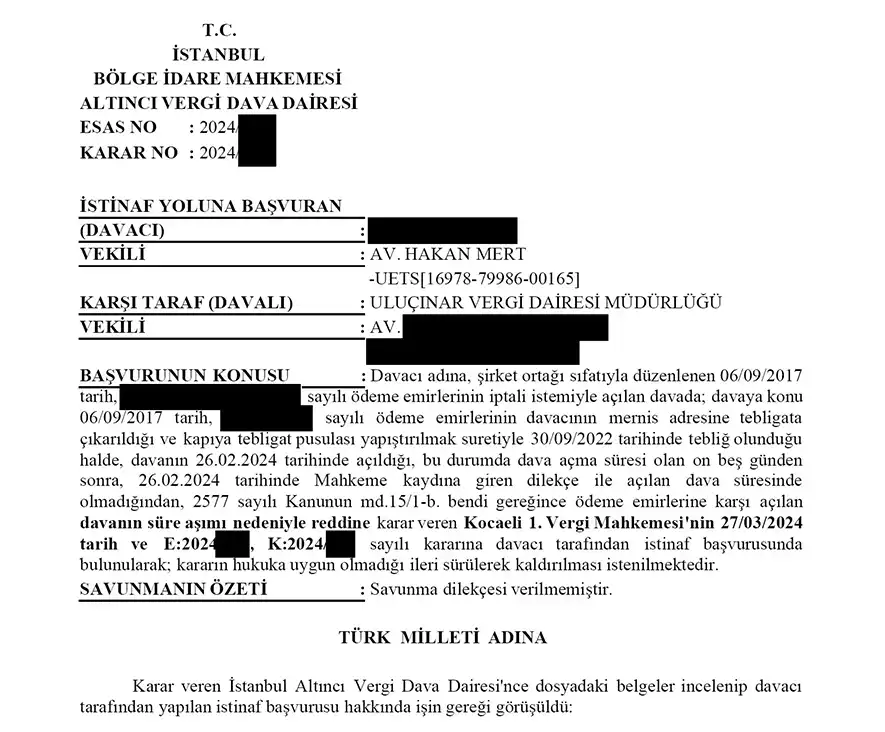 Bölge İdare Mahkemesi, kapıya yapıştırma usulüyle tebliğ işleminde usulün özüne aykırı eksiklikler bulunduğu gerekçesiyle ödeme emirlerinin tebliğinin geçersiz olduğuna hükmetmiş ve davanın süresinde açıldığını kabul etmiştir.